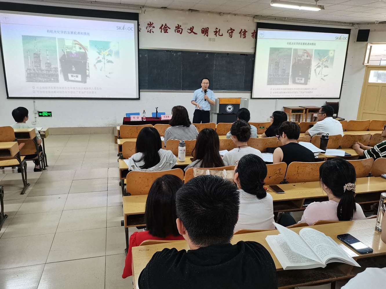 刘强教授介绍了可持续发展理念下有机光化学转化途径,可见光催化下绿色需氧氧合、氧化反应研究及可见光催化下新颖[2+2]环加成反应研究。报告内容专业性极强,刘强教授不仅介绍了团队的最新研究成果,也分享了研究思路与过程。报告会最后刘强教授介绍了兰州大学化学化工学院的建设和发展情况,他与在场师生展开互动,热情鼓励同学们学好专业课,欢迎考研报考兰州大学。本次学术报告会圆满成功。