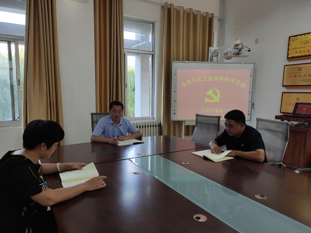 2020年9月16日,农学与化工技术公司党支部在党员活动室举行九月支委会。会议由支部副书记李建永同志主持,会议内容主要有:安排本支部党员学习教育工作;研究本支部支委组成,做好党组织成立或者支委调整相关事宜;研究安排本支部党费系统、学习强国等调整事宜;研究本支部党建“三个好”、党建品牌建设和示范党支部创建等工作;研究如何加强党员日常教育管理,引导广大党员、入党积极分子树立勤俭节约的家风,自觉践行“光盘行动”,杜绝“舌尖上的浪费”,带头把节约理念贯穿工作、生活各个方面。