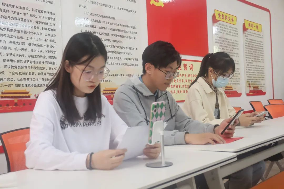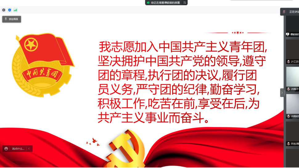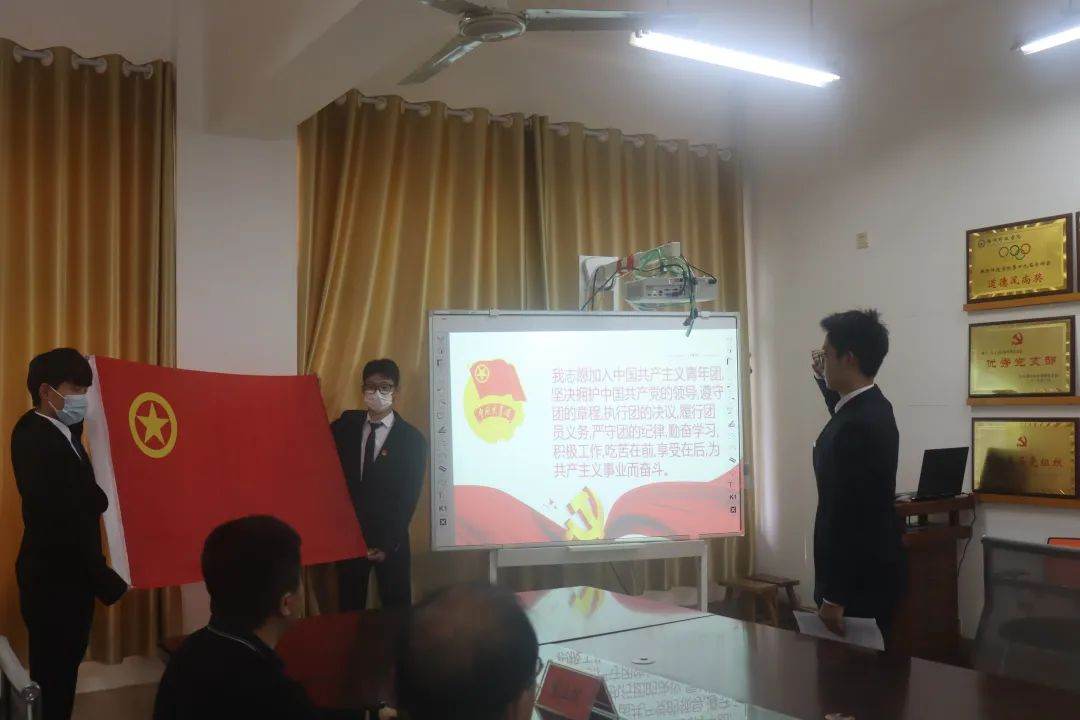 会议主持人谭皓宸带领全体同学重温入团宣誓词,入党积极分子员工代表王俞淇表示:在学习上不仅要有明确的学习目的、端正的学习态度,还要有良好的学习方法、较高的学习效率。在相关工作活动中,应兢兢业业,作风扎实,在各个方面发挥先锋模范作用,进一步向党组织靠拢。