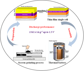 利用丝网印刷工艺,制备了薄膜单体电池,极大地减小了电池的厚度和减轻了电池的重量,实现了热电池薄型化和小型化,放电比容量和脉冲放电性能皆优于传统压片电池,可以满足高新技术武器对高电压、高比容量热电池的需求,并可实现工业化生产。