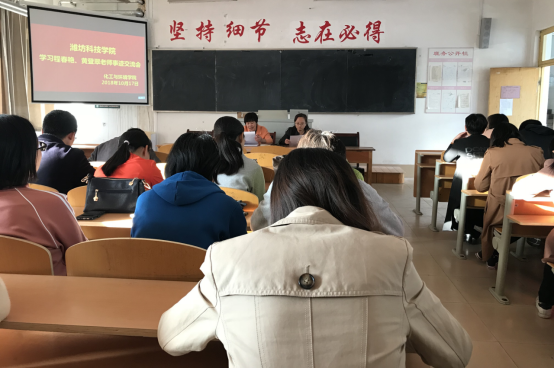为了充分发挥先进典型的示范引领作用,响应学校《关于学习程春艳、黄登翠老师的决定》,公司于2018年10月17日下午在教学楼103室召开了学习程春艳、黄登翠老师事迹交流会,会议由公司经理宋继梅主持,全体教师参加。