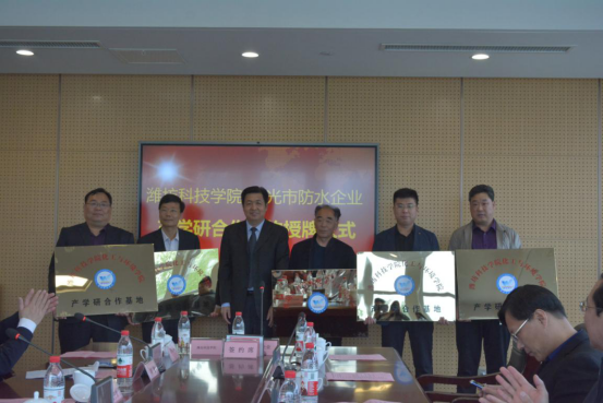 李广伟副经理代表BV伟德官方网站分别与潍坊京九防水工程集团有限公司总经理郑宝华、潍坊市晨鸣新型防水材料有限公司总经理王玉波、华丰防水材料股份有限公司董事长张连伟、潍坊博源新型防水材料有限公司董事长郑象敏、山东国鸿防水材料股份有限公司总经理隋广胜进行产学研合作签字、授牌。