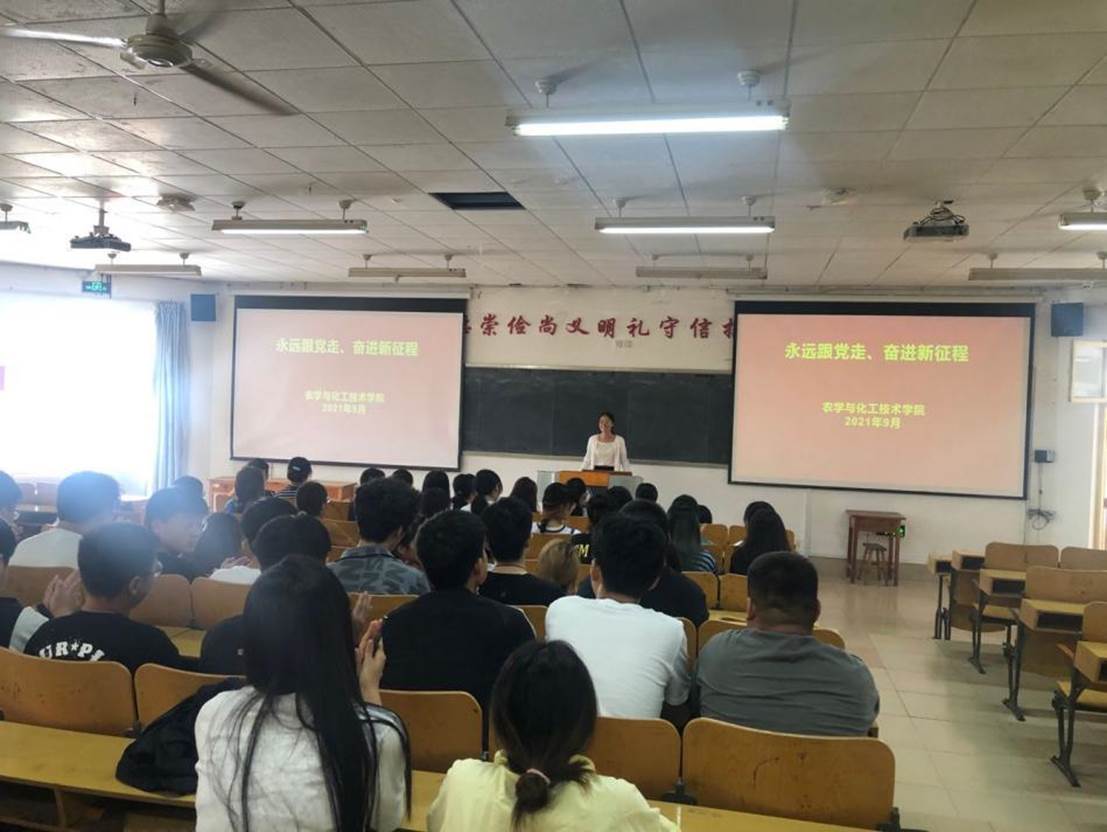 9月13日上午,辅导员辛延伟在教学楼211室为2020级应用化工技术专业员工开展“永远跟党走、奋斗新征程”主题思政课。她教育同学们站在“两个一百年”奋斗目标历史交汇点上,要以先辈先烈为镜,坚持磨练毅力,确保在思想上不交叉、不迷茫,行动上不后退、不掉队,政治上强定力、把方向,在新学年的征途中,厚植爱国情怀,强化使命担当,增强学习动力。