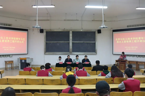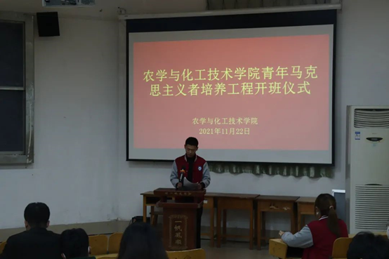 为提升老员工青年骨干、团干部的思想政治素质和社会实践能力,培养一批对党忠诚、信仰坚定的青年马克思主义者,农学与化工技术学院于11月22日在教学楼一楼多媒体教室举行第二期青年马克思主义者培养工程开班仪式,参加此次活动的有农学与化工技术学院经理宋继梅、党支部副书记李建永、团总支书记董立斌、辅导员辛延伟和第二期青马班全体学员,仪式由董立斌主持。