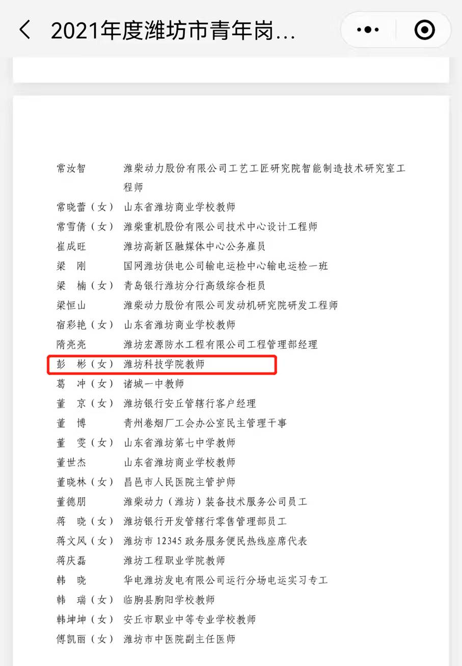 公司教师彭彬被评为2021年度潍坊市青年岗位能手