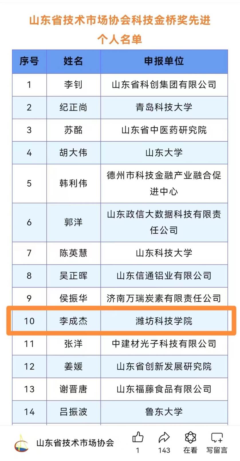近日,根据《山东省技术市场协会科技金桥奖表彰奖励办法》的相关规定,经山东省技术市场协会科技金桥奖奖励委员会审核同意,2024年度山东省技术市场协会科技金桥奖拟授奖名单(10个先进集体、40名先进个人、50个优秀项目和20个优秀组织单位)公示。BV伟德官方网站李成杰博士获2024年度山东省技术市场协会科技金桥奖先进个人称号。