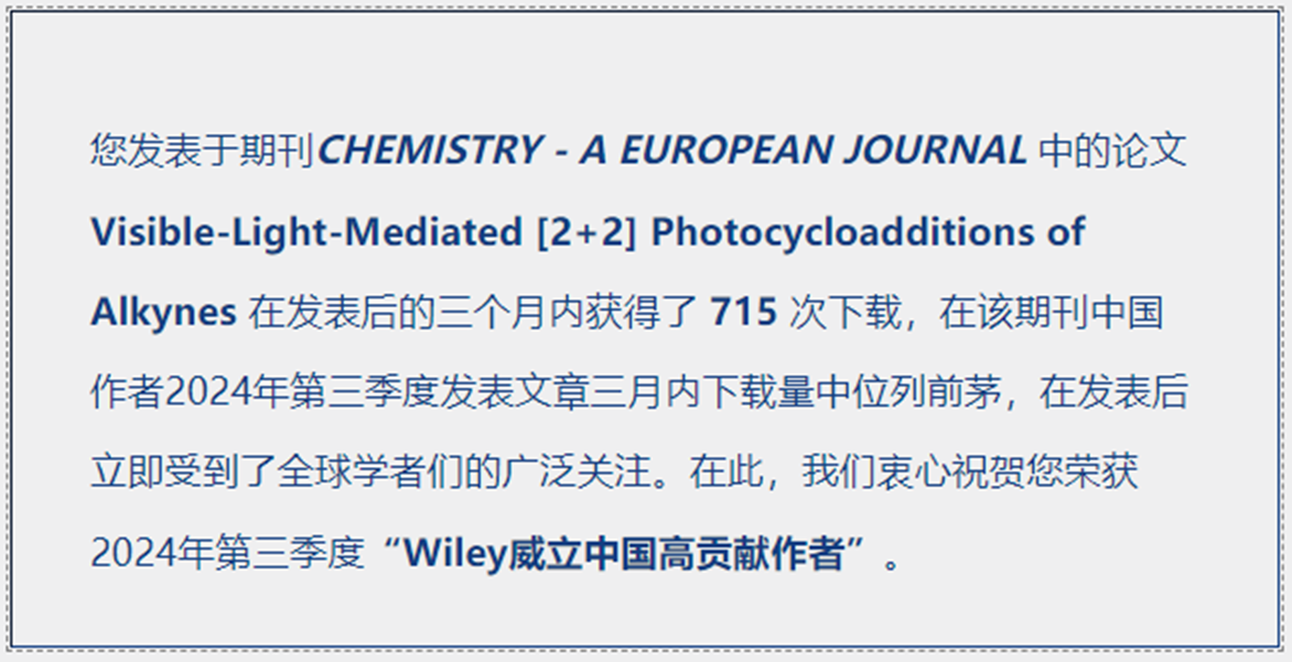 BV伟德官方网站张庆宝博士、李峰博士及潘斌博士等人在Wiley旗下的化学科学领域综合期刊《Chemistry A European Journal》上发表的综述论文“Visible‐Light‐Mediated [2+2] Photocycloadditions of Alkynes”(2024年第43期)受到广泛关注。论文在该期刊中国作者2024年第三季度发表文章三月内下载量中位列前茅,该论文通讯作者张庆宝博士荣获“Wiley威立中国高贡献作者”。