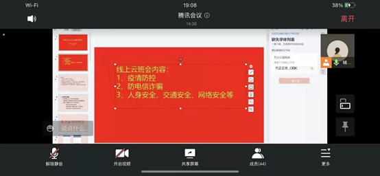 此外,辅导员、导师们利用腾讯会议召开了一次线上家长会,从校园防疫、家庭防疫和个人防疫等不同方面,与家长和同学们一起分享了防疫措施,倡议家长共同参与到疫情防控中来,且建议家长们积极配合校园的疫情防控。