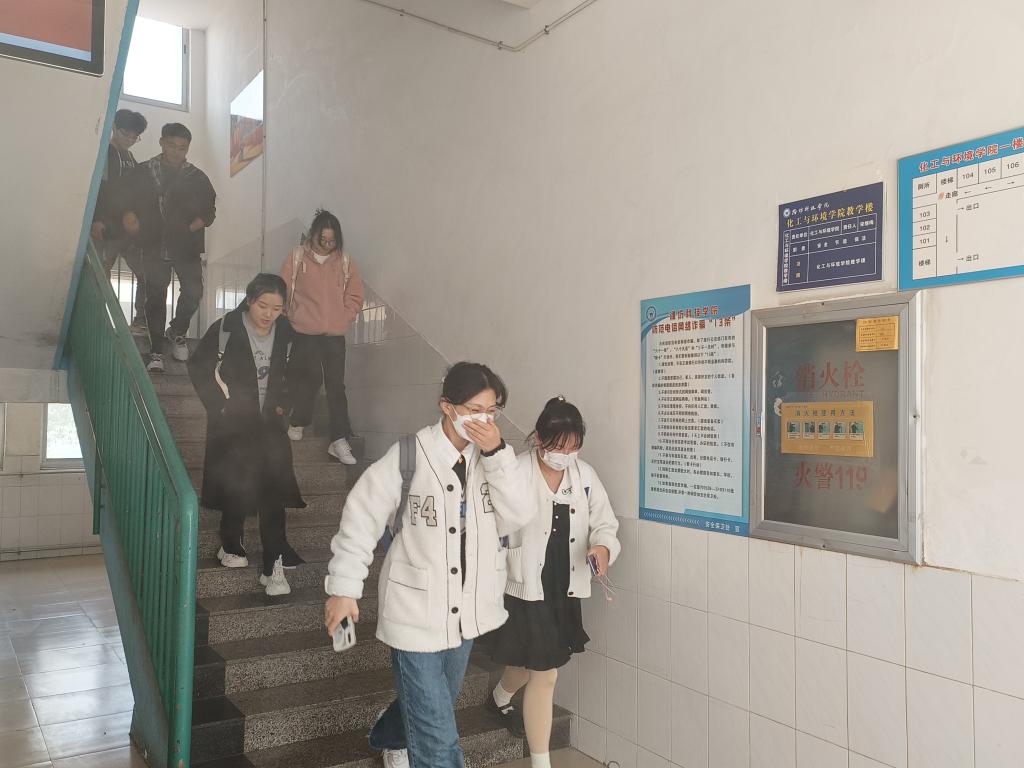 随着急促的火灾警报声响起,演练正式开始。同学们在志愿者的疏散引导下纷纷捂住口鼻,俯身迅速从楼梯、疏散通道向教学楼外转移。待转移至安全区域后,各班迅速清点人数。辅导员老师对这次消防演练的成果表达了充分的肯定,并为大家讲解了消防安全知识。由安全部同学介绍了灭火器的构造和使用方法。