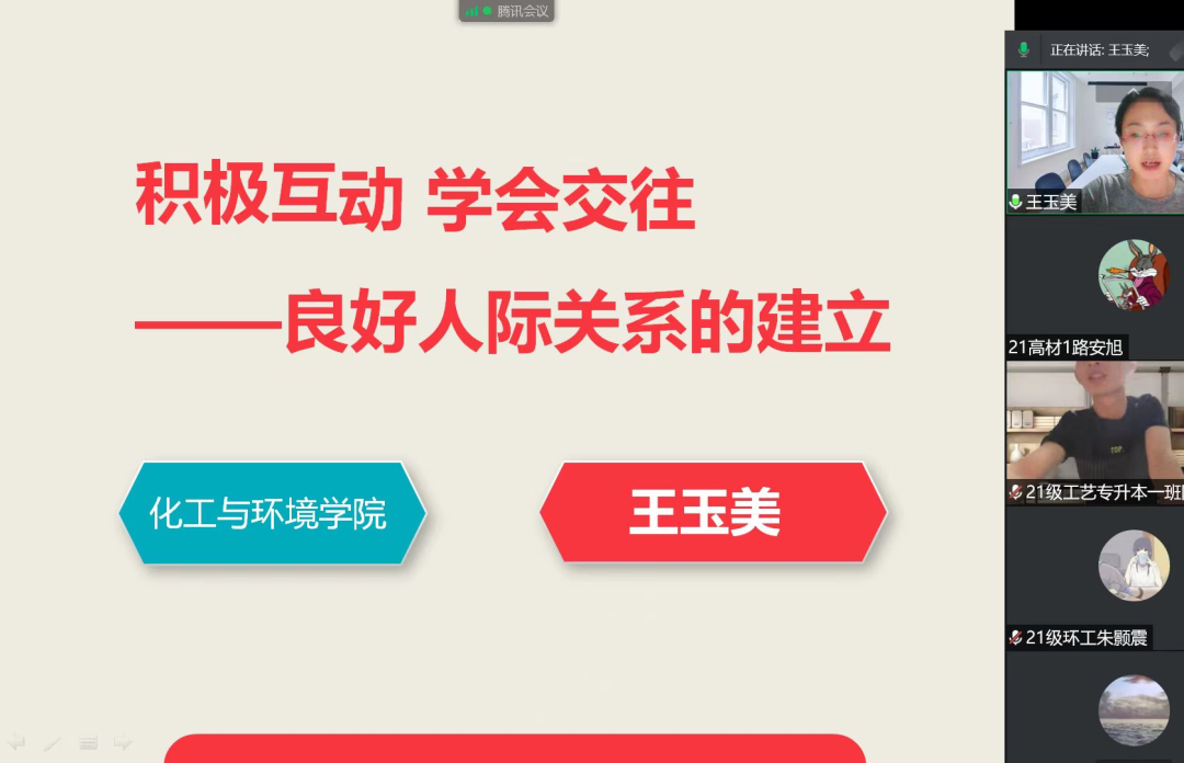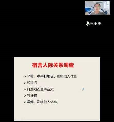 为引导同学们去建立良好的宿舍人际关系,正确地对待他人和自己,BV伟德官方网站心理部于4月21日在线举办以“积极互动,学会交往”主题心理讲座。本次会议由BV伟德官方网站心理辅导老师王玉美老师及全体在校宿舍舍长参加。