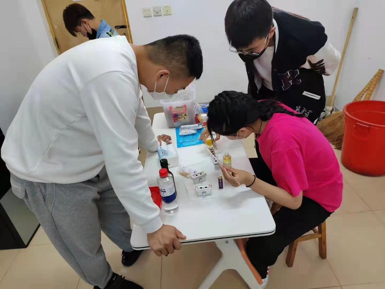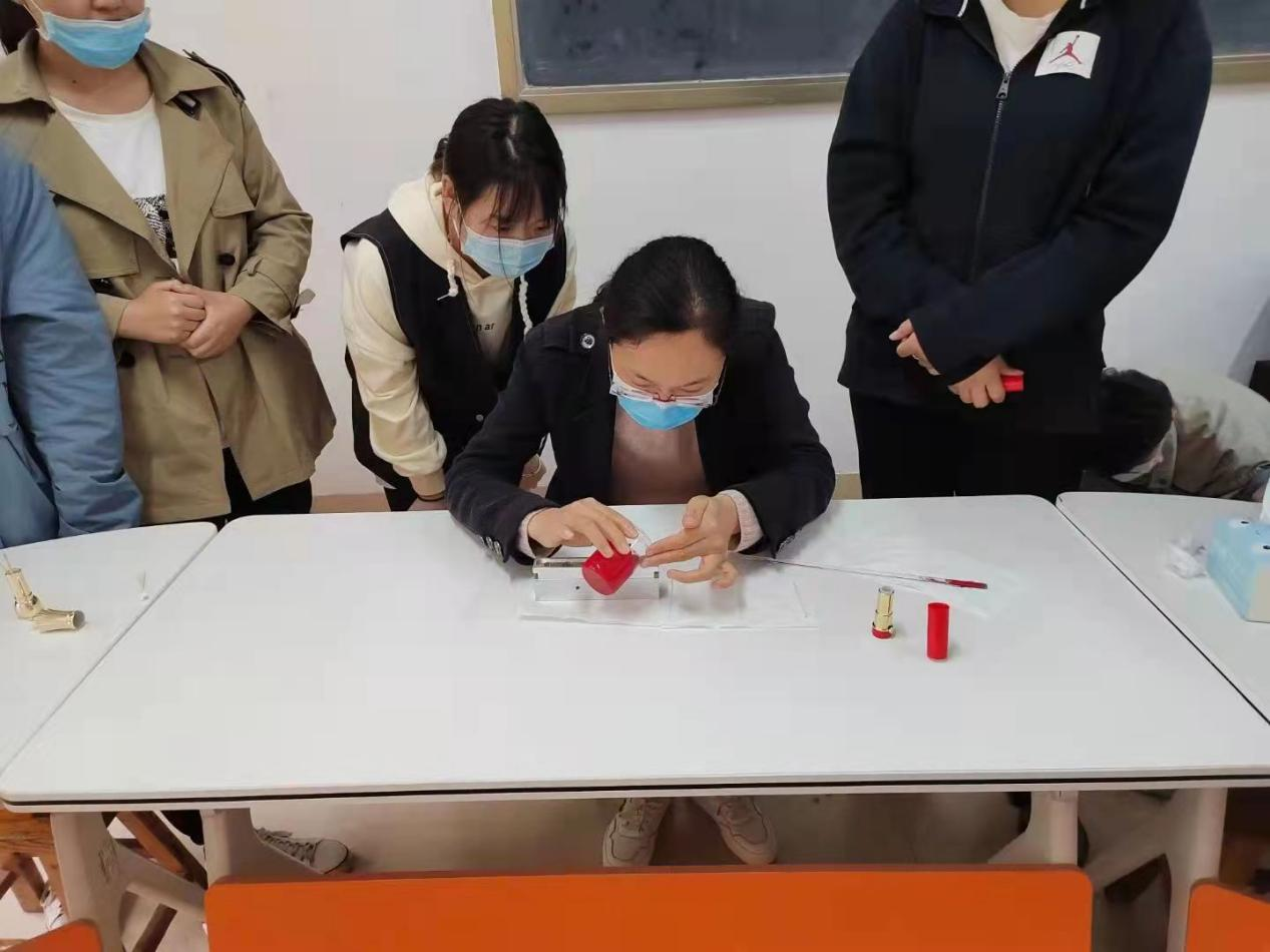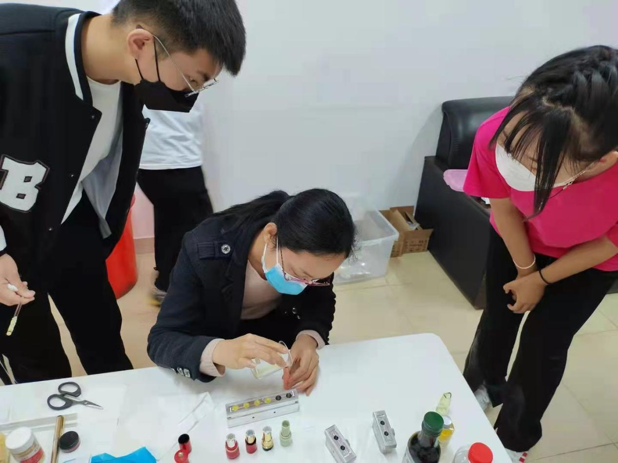 活动开始,王玉美老师讲解了口红的制作方法以及在制作过程中的注意事项。同学们依次完成原料准备、器具消毒、材料混合、加热、倒膜等制作程序后,挑选自己喜欢的外壳进行手工制作,最终呈现出各种绚丽多彩的口红制品。过程中部分同学因操作失误没有制作成功,王玉美老师为他们一一解答失败原因,鼓励再次制作。最后,同学们都成功制作出了满意的口红。