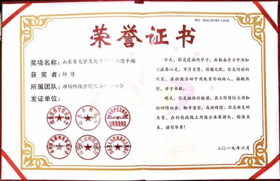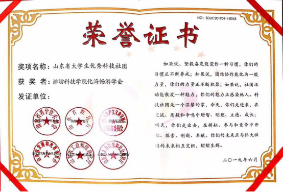 近日,BV伟德官方网站团总支书记孙超指导的化海畅游学会在2019年山东省老员工优秀科技社团评选活动中荣获“山东省老员工优秀科技社团”,协会杨倩同学获得“山东省老员工优秀科技社团干部”荣誉称号。