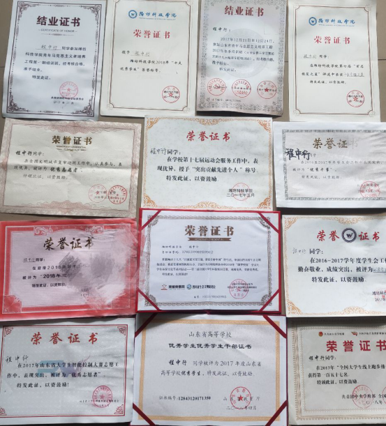 程中行始终坚持的一句格言是:“不放下努力本是我的任务,在现有的基础上争取再争取更是我的职责”。在校期间,他积极考取了“化工总控工、水污染处理工”等各种专业证书;综合测评成绩稳居班级前列;2019年获得“国家励志奖学金”,并积极涉猎学习其他知识;积极参加山东省公民科学素质提升专项行动,荣获“先进个人称号”,并在在寿光市“全国科普日”活动启动仪式上作为员工代表进行发言,线上网络观看人数超过三千万人次;2019 年 10 月,在国庆 70 周年期间作为潍坊科技公司代表前往浙江参加全国高校创业社团服务联盟游学活动,被评选为优秀学员。