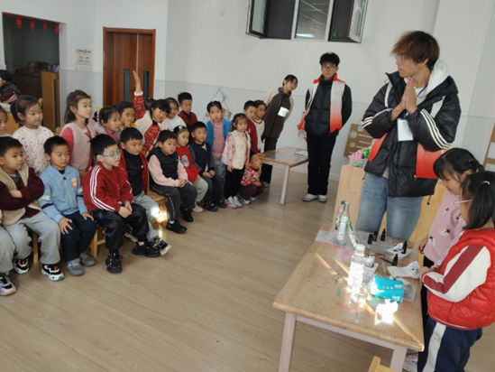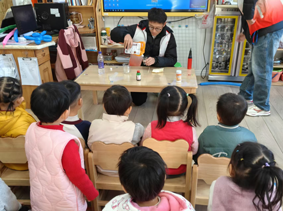 活动期间,志愿者准备了“神奇变色秀”、“泡沫喷泉”、“魔法变色花”等多个化学兴趣实验,引得孩子们阵阵惊呼与好奇张望。志愿者同学们用通俗易懂的语言为孩子们解说化学原理,助力幼儿开启科学探索之旅。志愿者还准备了互动游戏和手工制作活动,进一步增进与幼儿之间的情感交流与互动合作。在轻松愉悦的氛围中,孩子们不仅锻炼了动手能力和思维敏捷性,还收获了珍贵的友谊与快乐回忆。